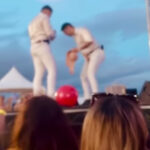 Javier Larrañaga en el momento en que le avientan un zapatazo.